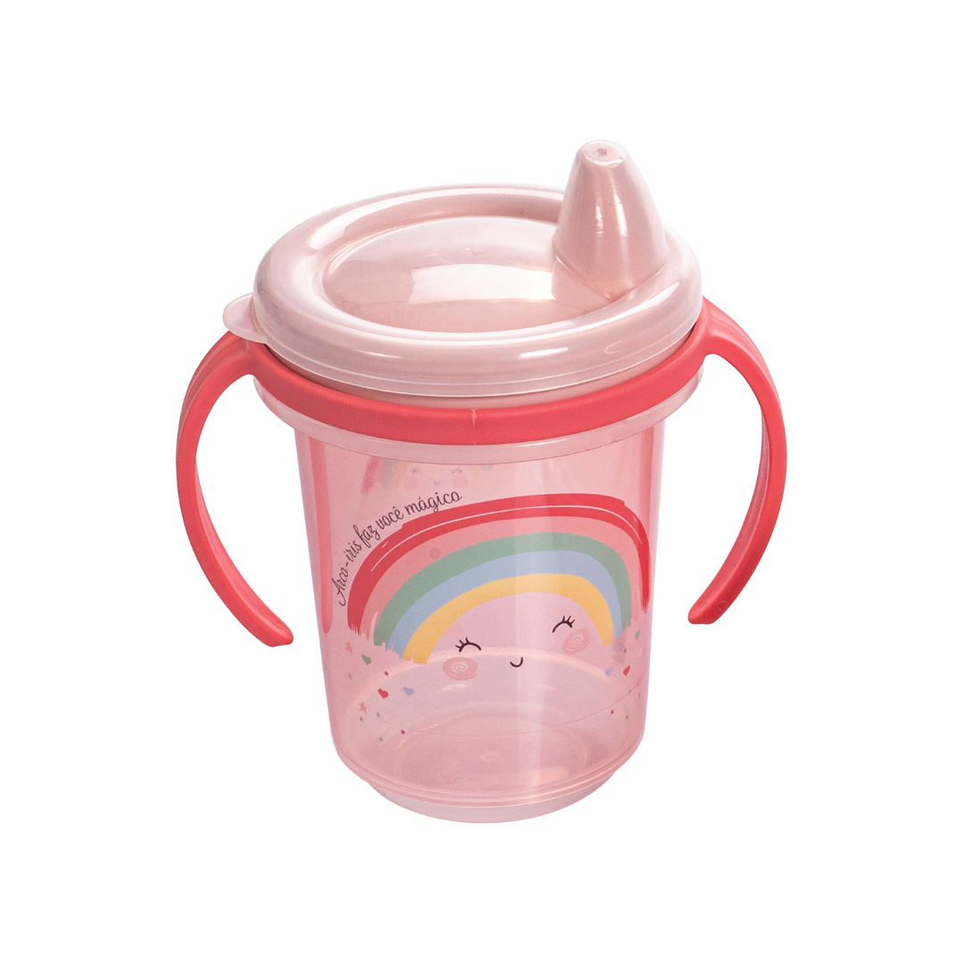 Com tampa rosca e capa protetora de bico. Antibacteriano: Impede o crescimento de bactérias prejudiciais a saúde infantil, garantindo mais higiene e segurança no armazenamento de alimentos. Linha coordenada: Linha completa de produtos para atender a higiene, organização e treinamento do seu bebê. Composição em um rosa delicado e estampa de de arco-íris. Fabricado em polipropileno (PP). Livre de bisfenol-A (BPA FREE).